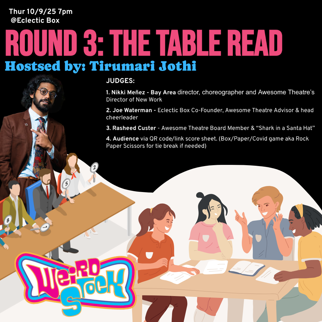 So I was very fortunate to move forward to the third round of the WeirdStock competition with Awesome Theatre. Audiences are invited to join the four remaining writers on Thursday, 10/09 at 7pm to watch table-reads of 15 minute samples of our scripts.